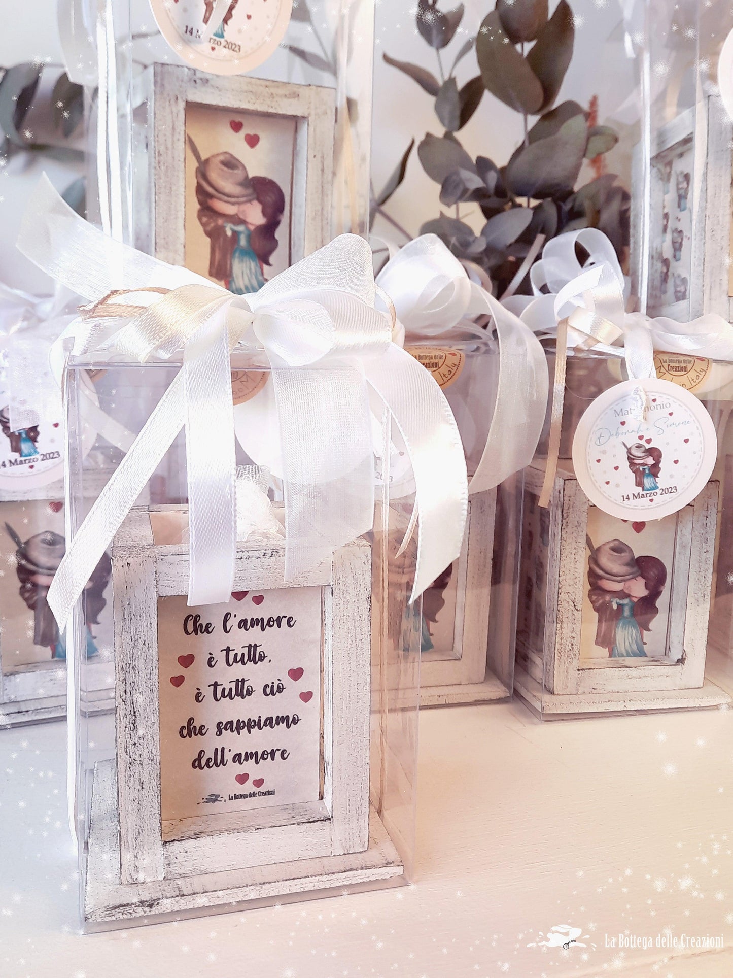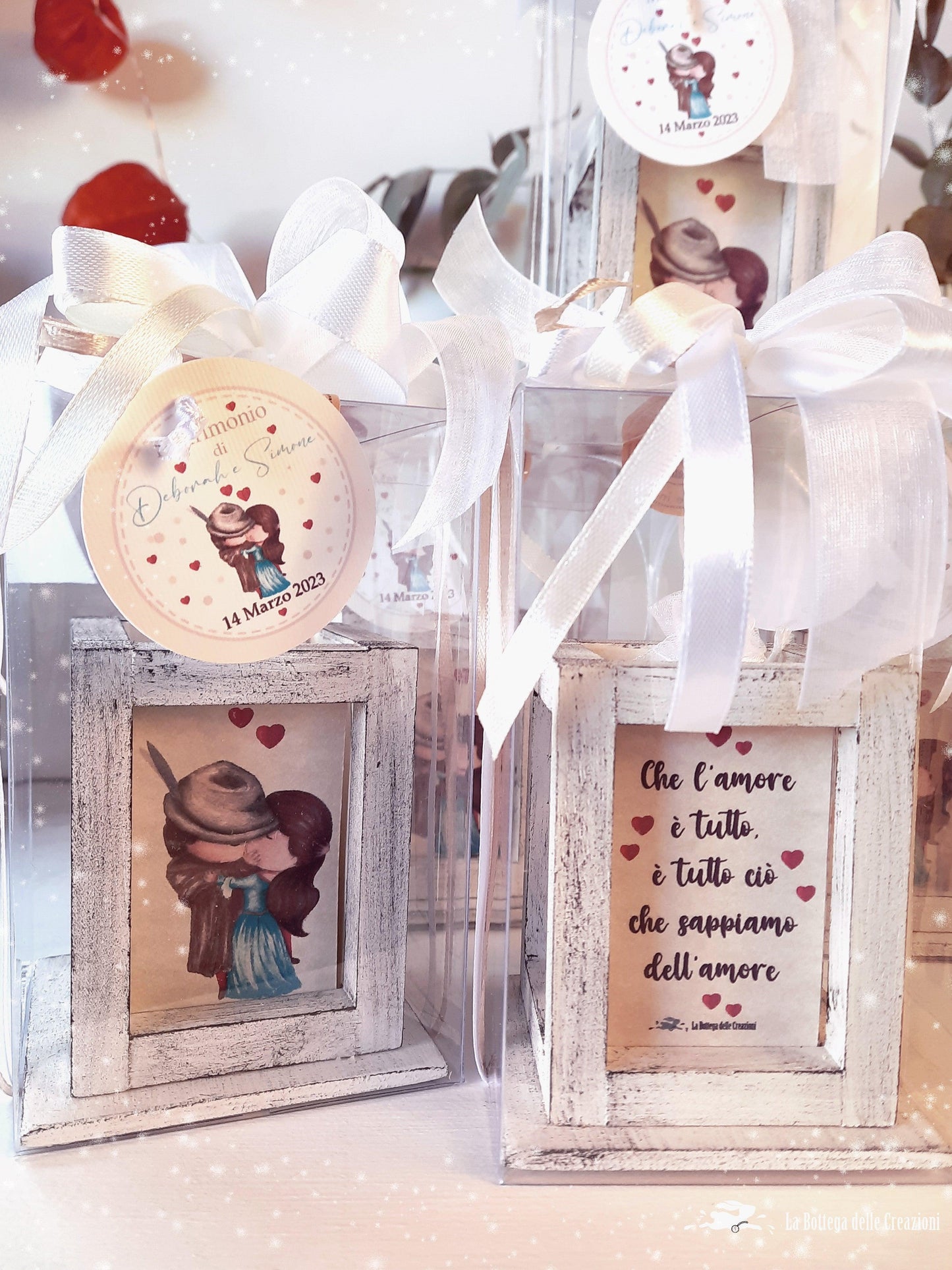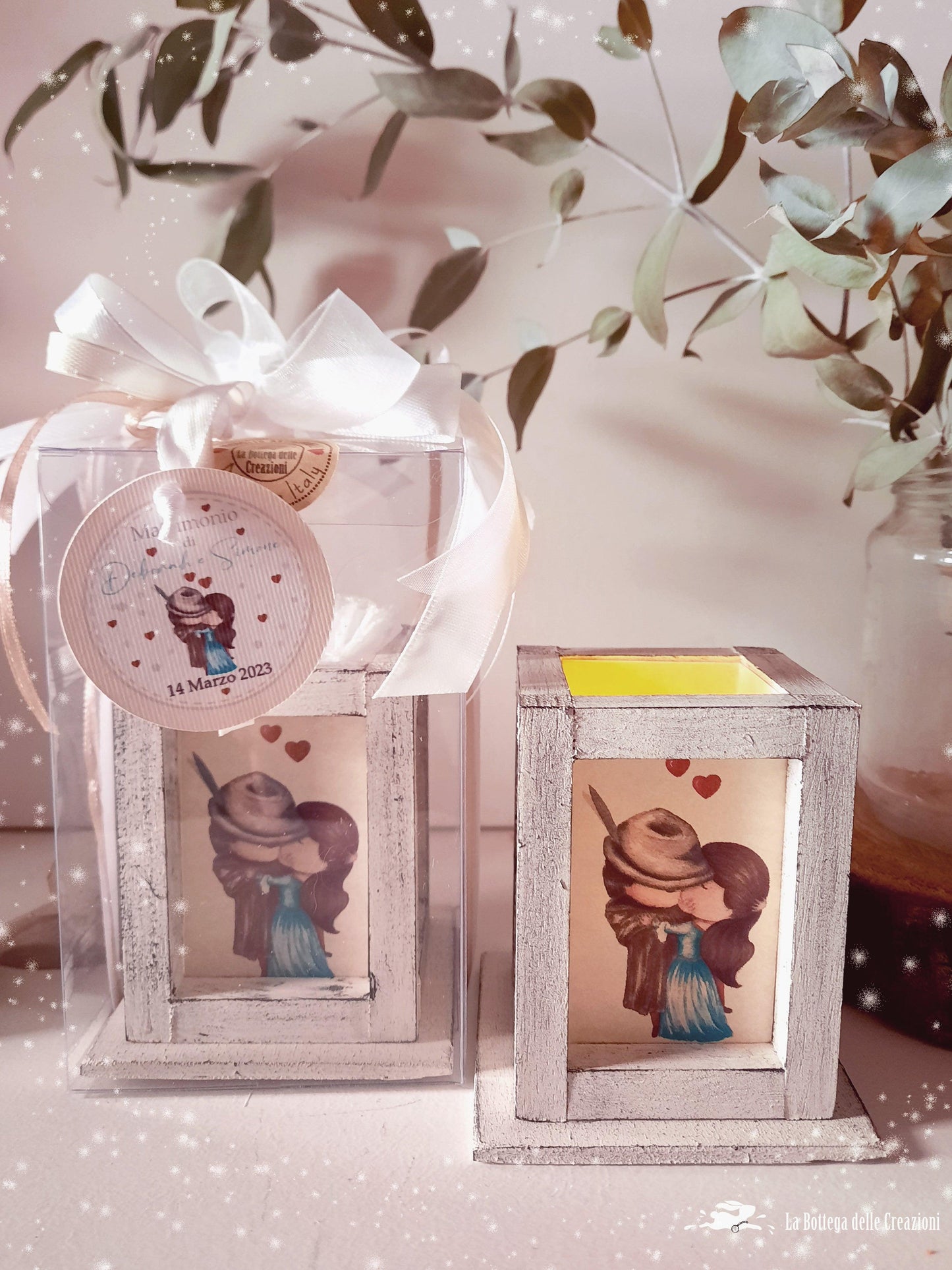 Bomboniere Lanterne Artigianali Il Bacio di Hayez per i vostri eventi speciali! Con lucetta a led al loro interno, illustrate con disegno di nostra creazione ispirato al famoso dipinto.