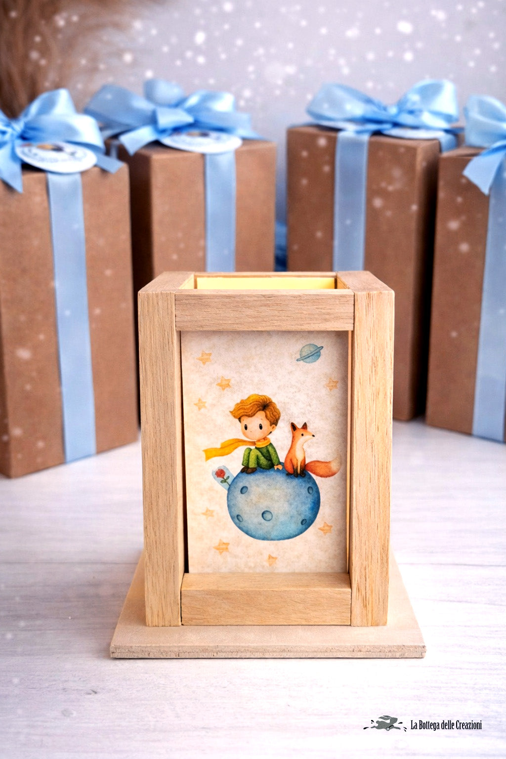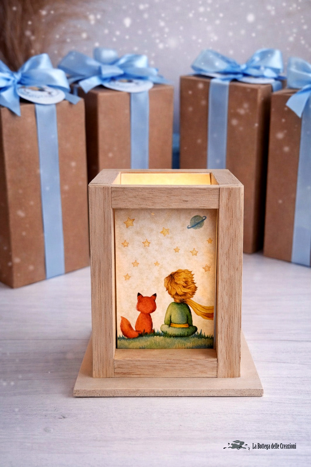 Bomboniere Lanterne Artigianali Piccolo Principe 1: Adorabili Bomboniere Lanterne in legno e carta pergamena fatte a mano, con lucetta a led, illustrate a tema Piccolo Principe con disegni di nostra creazione !